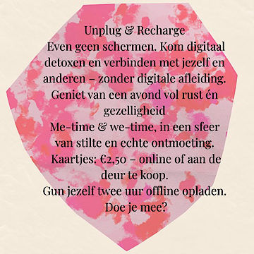 Op zondag 2 november gaan we een avond offline voor wat me- en we-time, zonder afleiding van telefoon, tablet of andere schermen en voor echte verbinding met jezelf en anderen. Laat je telefoon (/tablet/laptop/smartwatch) thuis, lever hem aan het begin van de avond in of zet hem uit als je hem absoluut bij je wilt houden.